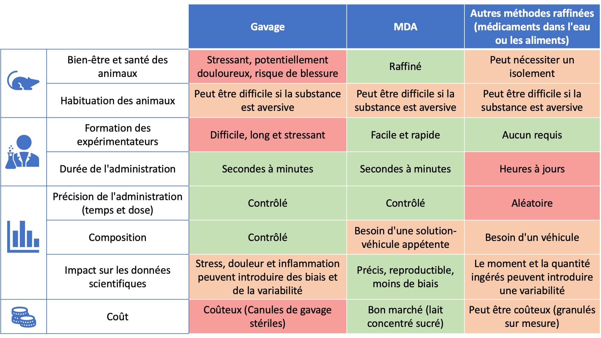 En permettant l'administration orale de substances en toute sécurité et sans stress, la MDA représente un énorme raffinement pour les animaux. Plus facile à apprendre et à réaliser que la technique du gavage, moins stressante, plus agréable et moins coûteuse, la MDA bénéficie également aux expérimentateurs (chercheurs et techniciens animaliers) et leur permet d'avoir de meilleures interactions avec les animaux tout en gagnant du temps, notamment pour les études longues (Heraudeau et al., 2023).